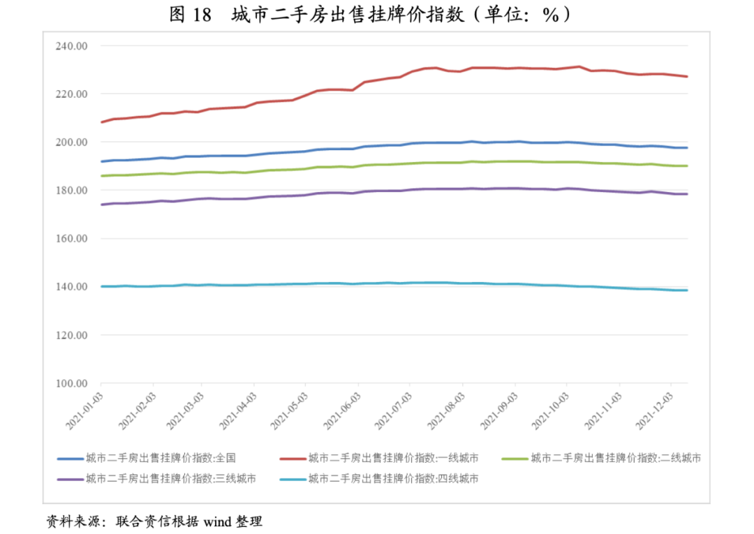 從70大中城市新建商品住宅價(jià)格指數(shù)看,進(jìn)入2021年,上下半年價(jià)格變動(dòng)呈現(xiàn)明顯的分化特征:上半年,一、二、三線城市住宅價(jià)格指數(shù)環(huán)比均保持正增長,且增幅持續(xù)增加;下半年住宅價(jià)格環(huán)比急轉(zhuǎn)急下,隨著購房者房價(jià)上漲預(yù)期的降低,各線城市價(jià)格自9月份開始回落,其中一線城市相對保持穩(wěn)定,二、三線城市有繼續(xù)下探趨勢。從二手房出售掛牌價(jià)格看,8月后各線城市價(jià)格均呈現(xiàn)波動(dòng)后下降態(tài)勢,但目前看降幅較小。