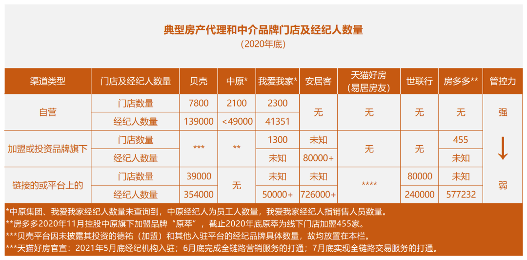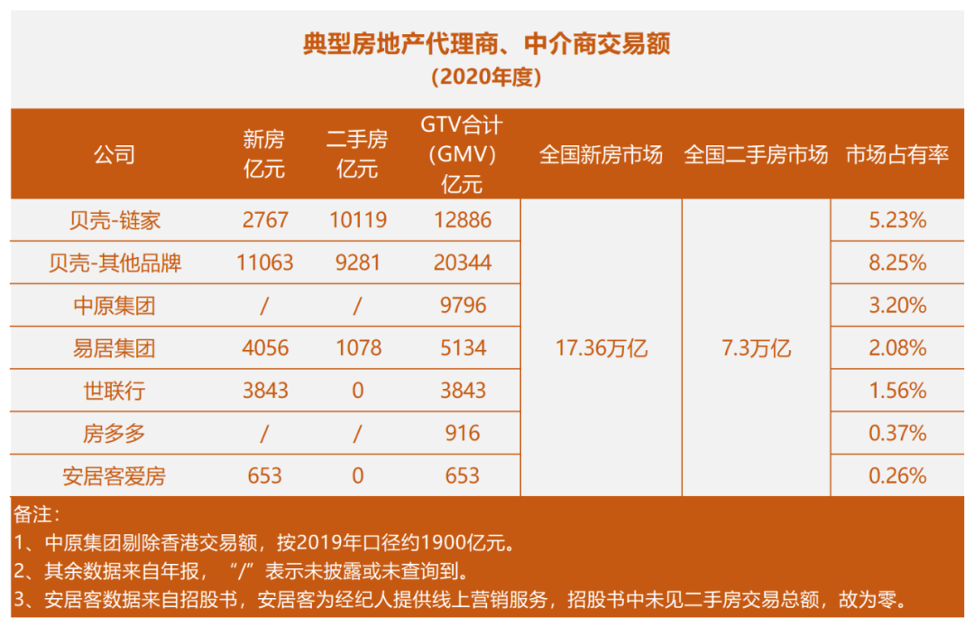 貝殼、房多多、房天下、我愛我、世聯(lián)行2020年報(bào),安居客招股書,中原集團(tuán)官網(wǎng)。