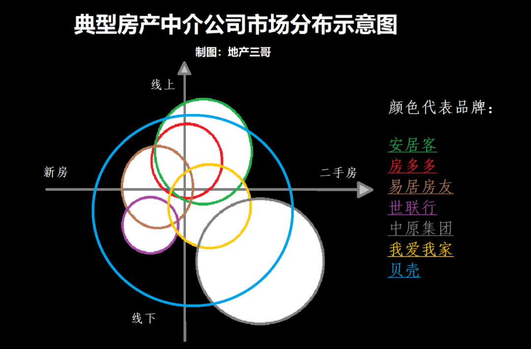 如果按照線上、線下、新房、二手房對(duì)房產(chǎn)中介市場(chǎng)進(jìn)行坐標(biāo)細(xì)分,那么各家品牌的示意圖大致如下: