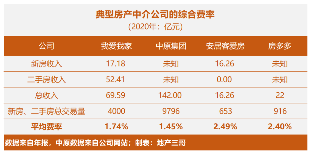 我愛我家、中原集團(tuán)等未公開新房和二手房具體的交易量,我們僅能推斷其整體的收費(fèi)率: