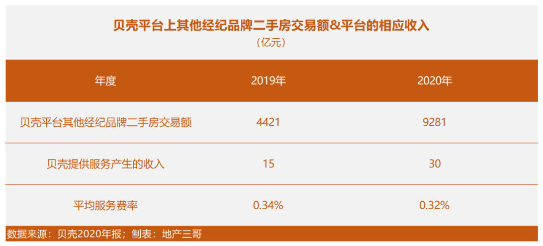 2019-2020年,貝殼平臺(tái)對(duì)其他經(jīng)紀(jì)品牌二手房交易額收取的服務(wù)費(fèi)率0.34%、0.32%。