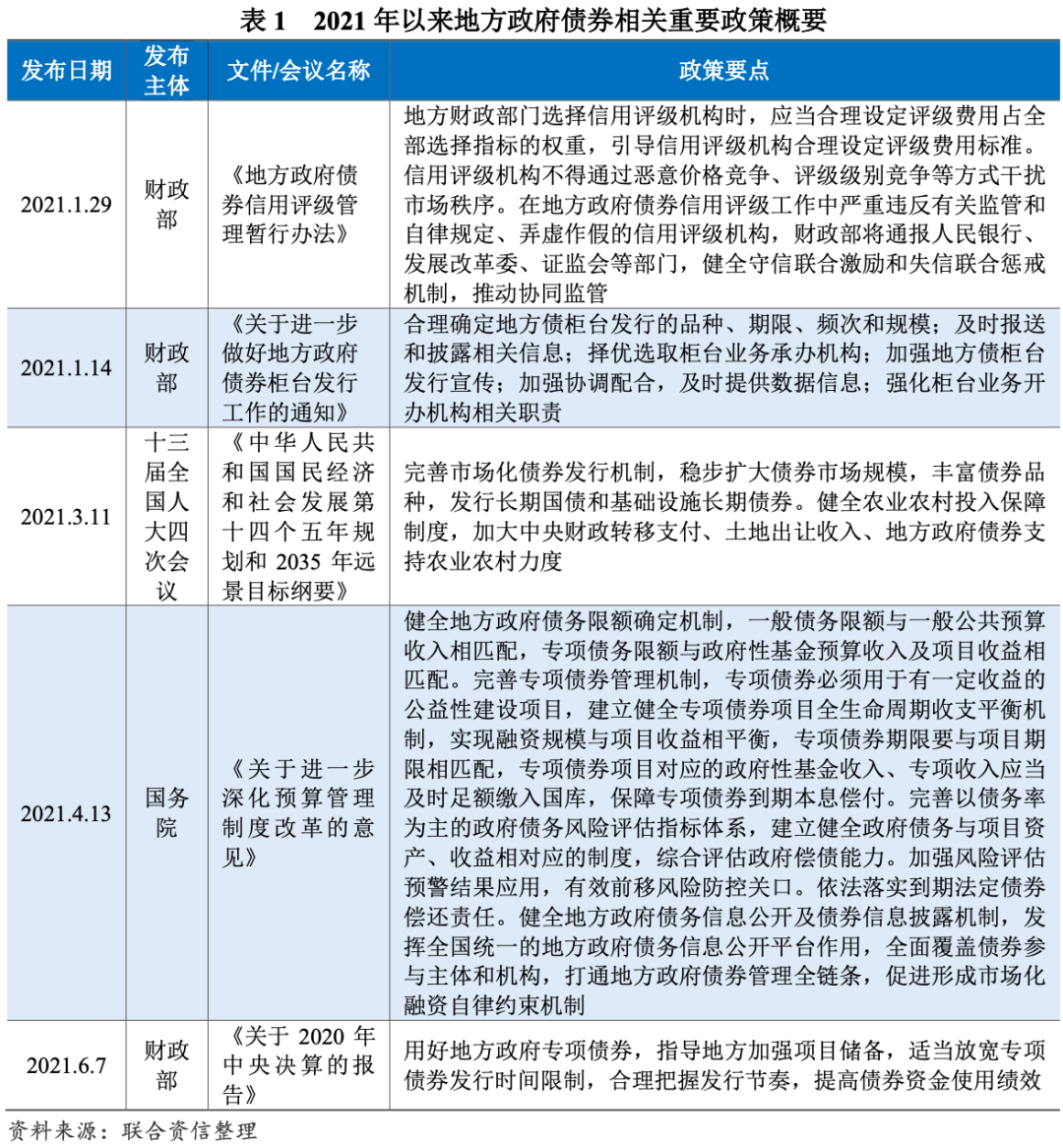 2021年上半年,在新冠肺炎疫情全球大流行的背景下,面對復雜多變的國內外環境,我國持續鞏固疫情防控成果、精準實施宏觀政策,經濟持續穩定恢復,經濟發展呈現穩中加固、穩中向好態勢。根據國家統計局初步核算,2021年上半年,我國實現國內生產總值53.22萬億元,按可比價格計算,同比增長12.7%,增速較一季度回落5.6個百分點;兩年平均增長5.3%,兩年平均增速較一季度加快0.3個百分點。分季度看,一季度同比增長18.3%,兩年平均增長5.0%;二季度增長7.9%,兩年平均增長5.5%。但全球疫情仍處于持續演變中,我國經濟發展面臨的內外部不確定因素仍然較多,經濟的高質量發展面臨國內經濟恢復不均衡和持續深化供給側結構性改革的挑戰,地方政府債作為重要的逆周期調控工具仍需持續發力。整體看,2021年以來地方政府債券相關政策主要體現在加大地方政府債券支持基礎設施建設力度、完善地方政府債券發行制度、完善地方政府債務管理機制以及進一步規范地方政府債券信用評級管理等方面。