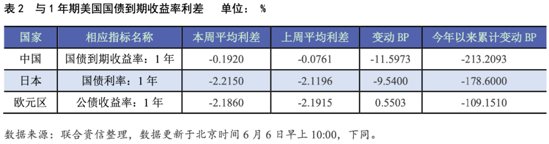 本周各期限中美國債平均收益率利差全線走擴,1年期、5年期和10年期中美國債平均收益率利差較上周走擴11.60個、9.81個BP和11.82個BP至-0.19%、-0.33%和-0.15%。本周1年期、5年期和10年期日美國債平均收益率利差較上周走擴9.54個、13.92個和11.98個BP至-2.22%、-2.89%和-2.66%。本周1年期、5年期和10年期歐元區公債與相應期限美債平均收益率利差較上周收窄0.55個、8.76個和6.89個BP至-2.19%、-1.89%和-1.65%。本周英國慶祝女王登基70周年,全國連放四天公共假期,暫無數據更新。