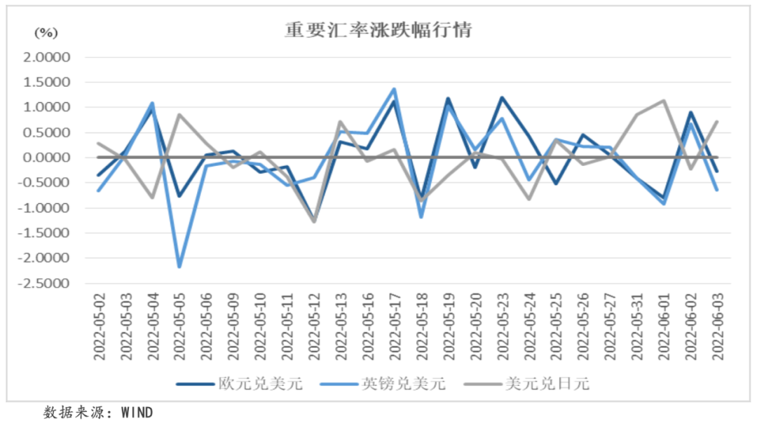 本周,歐元區5月通脹率創下歷史新高,引發市場對于歐洲央行7月加息的預期進一步走強,對歐元形成一定支撐,但美元走強仍對歐元造成很大壓力,本周歐元兌美元收于1.0718,周內累計收跌0.56%。本周,大量保守黨議員就“派對門”事件對英國總理鮑里斯進行批判,或將引發不信任投票,再加上英國與歐盟在北愛爾蘭協議問題上的爭論也在逐步升級,導致北愛爾蘭獨立勢力也有所活躍,事態恐進一步惡化,英鎊因此承壓,本周英鎊兌美元收于1.2490,周內累計收跌1.29%。本周,隨著美聯儲開啟“縮表”進程,日美貨幣政策走勢的進一步分化打壓了日元的表現,大宗商品價格的上漲也對日本進口帶來壓力,美元兌日元收于130.8245,周內累計收漲2.54%,時隔兩周再次突破130大關。
