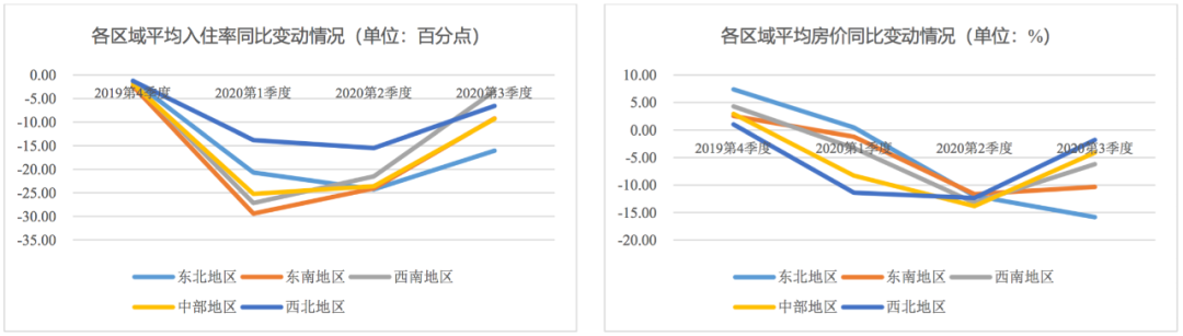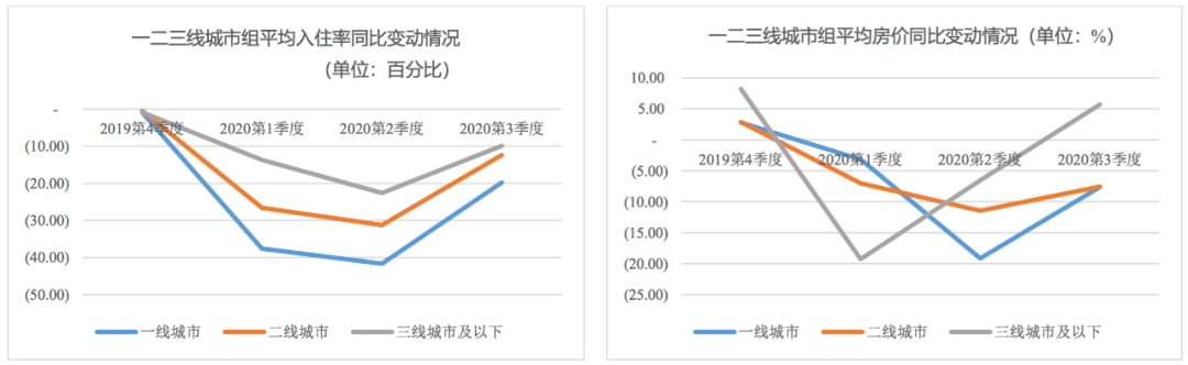 從不同等級城市組看,一二三線城市組酒店業(yè)在上半年均受疫情影響嚴重,三季度均有所好轉(zhuǎn),但不同等級城市組恢復(fù)情況有所不同。其中,一二季度房價和入住率下跌幅度從小到大為三線城市組、二線城市組和一線城市組,三線城市組酒店業(yè)受損相對較小;而三季度酒店業(yè)恢復(fù)程度由好到弱同為三線城市組、二線城市組和一線城市組。整體看,三線城市酒店業(yè)受疫情影響相對較小、恢復(fù)較快;而一二線城市酒店客源因全球疫情影響海外客源大幅減少并尚未完全恢復(fù),且一二線城市管控更嚴,酒店業(yè)恢復(fù)程度較慢。