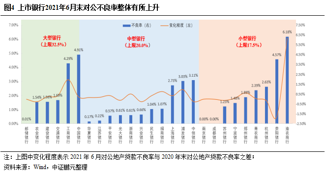 從有完整可比數據的26 家上市銀行來看,國有六大行2021年6月末平均對公房地產貸款不良率為3.04%,較 2020年末上升0.49個百分點,主要受工商銀行房地產不良率大幅上升1.97個百分點至 4.29%的影響;股份制銀行2021年6月末平均對公房地產貸款不良率為1.32%,較2020年末提升0.3個百分點,部分區域中小型銀行地產不良率上升較快,如渝農商行地產不良率大幅提升至6.18%,主要由于個別房地產企業因流動資金緊張,在建項目發生停工所致。