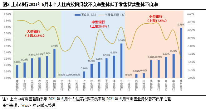 個人住房按揭貸款資產質量方面,上市銀行個人住房貸款不良率低位穩步下行,顯著低于零售貸款整體不良率。從有完整可比數據的26 家上市銀行來看,國有六大行2021年6月末個人住房按揭不良率為0.28%,較2020年末下行2bp;股份制銀行住房按揭不良率為0.24%,較2020年末下行1bp;區域性城農商行除鄭州銀行上行27bps較為明顯外,其余均保持低位。整體來看,政策發布半年以來上市銀行個人住房貸款不良率變化不大。另一方面,上市銀行個人住房貸款不良率整體處于低位運行,顯著低于零售貸款整體不良率,整體資產質量較高。