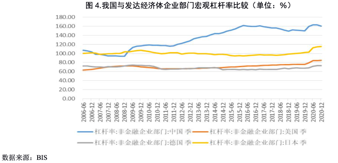我國(guó)企業(yè)部門杠桿率一直處于較高水平,疫情發(fā)生后監(jiān)管層為了穩(wěn)企保崗,支持企業(yè)渡過(guò)難關(guān),迅速注入流動(dòng)性,放松信用條件,企業(yè)部門宏觀杠桿率迅速攀升,2020年6月末達(dá)到165.2%的歷史最高值。此后,杠桿率雖然有所下降,但仍然維持在歷史較高水平(2021年一季度末為161.40%)。BIS數(shù)據(jù)顯示,2020年末我國(guó)非金融企業(yè)部門宏觀杠桿率為160.70%, 同期美國(guó)、日本、德國(guó)非金融企業(yè)部門的宏觀杠桿率分別為84.60%、115.6%和73.2%,均遠(yuǎn)低于我國(guó)。后疫情時(shí)期,我國(guó)經(jīng)濟(jì)恢復(fù)對(duì)債務(wù)驅(qū)動(dòng)的依賴依然較強(qiáng),經(jīng)濟(jì)增長(zhǎng)的基礎(chǔ)不夠牢固,因而具有一定的脆弱性,易受國(guó)內(nèi)國(guó)際風(fēng)險(xiǎn)事件的沖擊,或?qū)⒊掷m(xù)面臨防范化解風(fēng)險(xiǎn)的較大壓力。