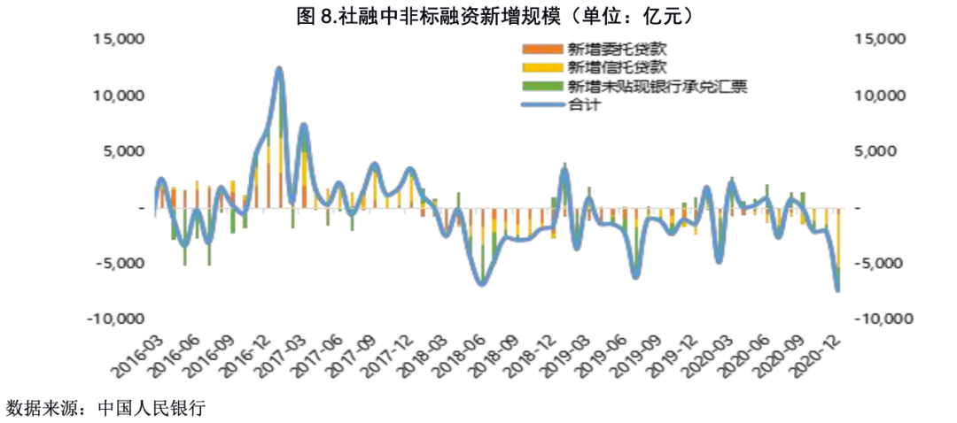 另外,需關(guān)注2021年非標(biāo)融資縮量對(duì)企業(yè)流動(dòng)性的壓力。2018年以來(lái)新增非標(biāo)融資出現(xiàn)了負(fù)增長(zhǎng)的趨勢(shì),企業(yè)的融資渠道逐步縮窄。自2020年四季度以來(lái),非標(biāo)融資縮量程度再次加深,資管新規(guī)過(guò)渡期延長(zhǎng)至2021年底,2021年也將大概率延續(xù)縮量趨勢(shì),將對(duì)信用債的償付能力產(chǎn)生負(fù)面影響,尤其是通過(guò)非標(biāo)融資較多的城投和房地產(chǎn)企業(yè)。