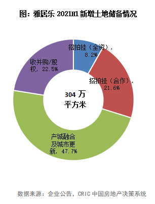 多元渠道擴(kuò)充土儲(chǔ),七成非招拍掛取得。除招拍掛市場(chǎng)外,雅居樂(lè)還通過(guò)收并購(gòu)、產(chǎn)城融合、城市更新等方式補(bǔ)充土儲(chǔ),這部分新增土儲(chǔ)建面占比達(dá)70.2%,相比2020年增長(zhǎng)15.2個(gè)百分點(diǎn)。其中,產(chǎn)城融合和城市更新共計(jì)占比47.7%、收并購(gòu)占22.5%。值得一提的是,當(dāng)前通過(guò)產(chǎn)城融合和城市更新鎖定的預(yù)計(jì)土儲(chǔ)建面分別為2410萬(wàn)平方米和1377萬(wàn)平方米,待未來(lái)納入土儲(chǔ)后,這部分占比將進(jìn)一步提升,顯然已成為企業(yè)重要的拿地手段。
