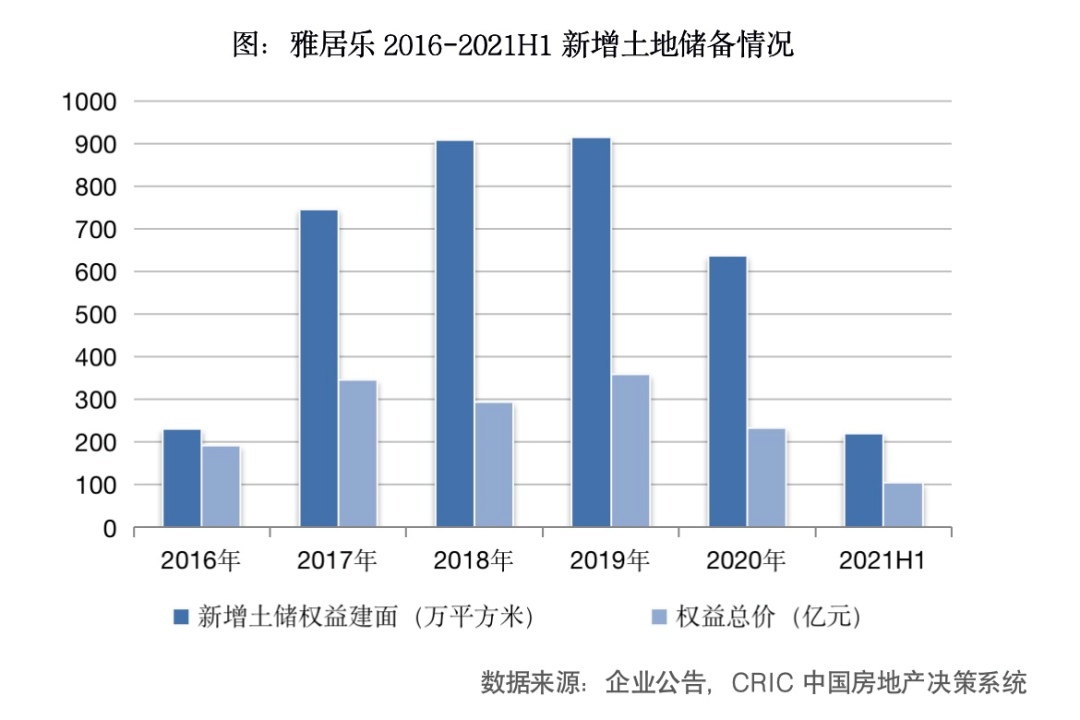 采取審慎的投資態(tài)度,拿地銷售比0.29。2021年上半年雅居樂(lè)新增22幅土地,新增土儲(chǔ)建面304萬(wàn)平方米,總地價(jià)216億元,對(duì)應(yīng)樓面地價(jià)為7109元/平方米。同時(shí)新增權(quán)益土地建面為220萬(wàn)方,權(quán)益拿地金額105億元。企業(yè)保持“拿好地、不拿錯(cuò)地”的謹(jǐn)慎態(tài)度,全口徑拿地銷售金額比為0.29,略低于TOP30房企平均0.31的拿地銷售比。