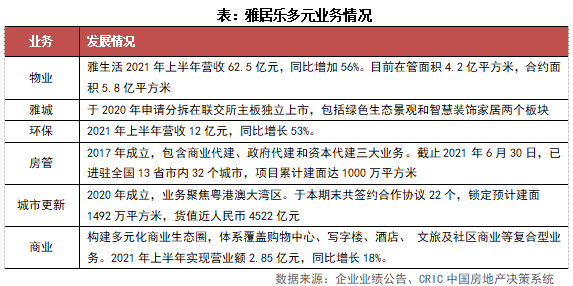 【多元營(yíng)收占比進(jìn)一步提升】上半年多元業(yè)務(wù)營(yíng)收達(dá)約64.96億元,同比增長(zhǎng)率為54%,多元營(yíng)收占比增長(zhǎng)至16.8%。目前多元業(yè)務(wù)主要包括雅生活、雅城、商業(yè)、房管、城市更新和環(huán)保等板塊,均取得了進(jìn)展。