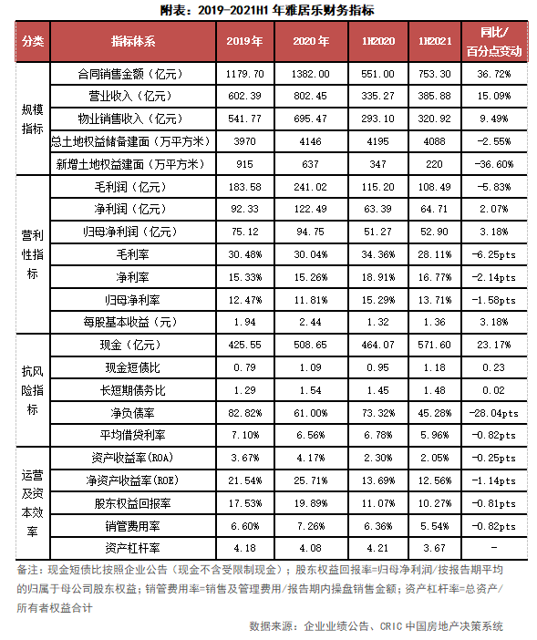 【營(yíng)收同比增長(zhǎng)15%,盈利能力尚屬穩(wěn)健】上半年?duì)I業(yè)收入為385.88億元,同比增長(zhǎng)15.1%。當(dāng)前合同負(fù)債規(guī)模有限,為保證營(yíng)收穩(wěn)定,動(dòng)態(tài)調(diào)整推盤節(jié)奏,會(huì)考驗(yàn)企業(yè)的研判能力和應(yīng)變能力。毛利率為28.1%,同比下降6.3個(gè)百分點(diǎn)。2021年上半年企業(yè)獲取土地成本增加,當(dāng)前總土儲(chǔ)成本由2020年的3627元/平方米上升至3700元/平方米。