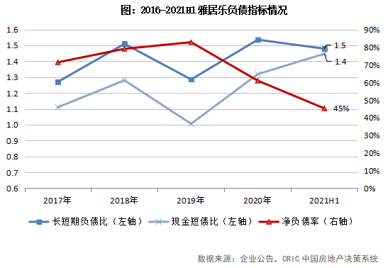 凈負(fù)債率持續(xù)下降,成功跨入綠檔。2021年中,雅居樂(lè)的凈負(fù)債率為45.3%,相比于期初大幅下降15.7個(gè)百分點(diǎn),與2019年的82.8%對(duì)比,更是實(shí)現(xiàn)了兩連降,遠(yuǎn)低于行業(yè)平均89.1%。此外,剔除預(yù)收款后的資產(chǎn)負(fù)債率達(dá)68.4%,相較期初下降了3.5個(gè)百分點(diǎn),成功跨入綠檔。