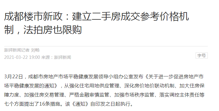 3月22日,成都市房地產(chǎn)市場平穩(wěn)健康發(fā)展領(lǐng)導(dǎo)小組辦公室發(fā)布《關(guān)于進(jìn)一步促進(jìn)房地產(chǎn)市場平穩(wěn)健康發(fā)展的通知》,其中提到了建立二手房成交參考價格機制,并將法拍房也納入限購范疇。