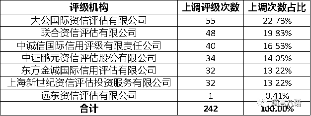 通過對主體評級上調(diào)數(shù)據(jù)中的評級機(jī)構(gòu)進(jìn)行統(tǒng)計(jì)分析,見下圖: