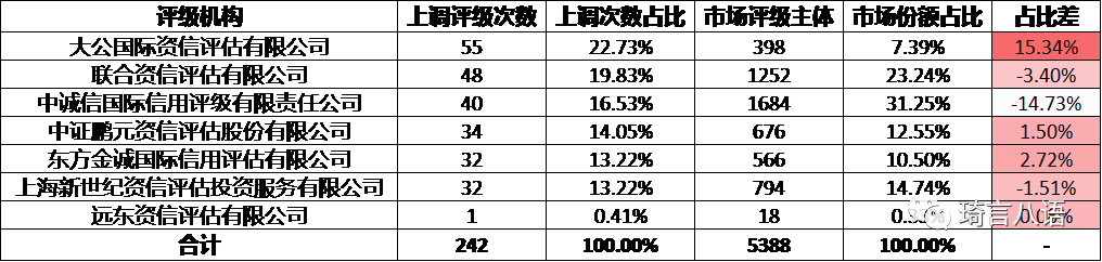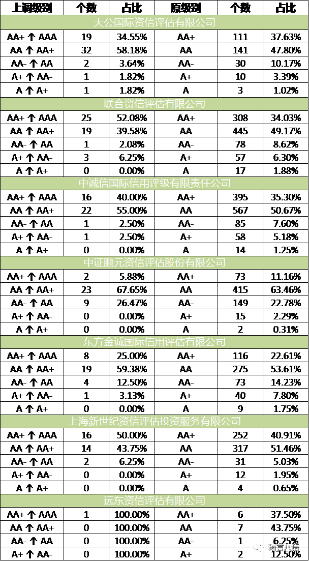 可以看出,大公上調(diào)次數(shù)最多,占比高達(dá)22.73%,其次是聯(lián)合及中誠信,占比分別為19.83%及16.53%,鵬元、東方金城及上海新世紀(jì)差別不大。