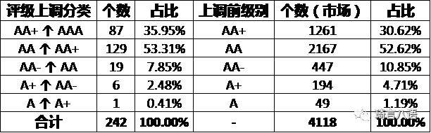 可以看出,242個(gè)評級上調(diào)中,從AA上調(diào)到AA+的占比最多,高達(dá)53.31%,其次是從AA+上調(diào)至AAA的,占比35.95%。該結(jié)構(gòu)與全市場中AA及AA+在[A、A+、AA-、AA、AA+]5個(gè)級別中的占比類似。也就是說,今年主體評級的上調(diào)是全市場整體的上移,對于各級別而言,差異不大。當(dāng)然,最終導(dǎo)致市場中AA+及AAA等高級別占比越發(fā)集中了