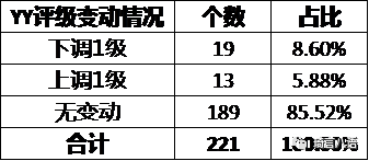 其次,查詢上述221個(gè)主體在2020年1月1日至2020年9月20日期間的YY評級變動情況,發(fā)現(xiàn)下調(diào)19家,無變動189家,上調(diào)僅13家,占比不到6%,詳見下圖: