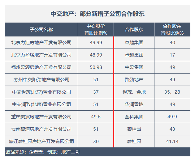2、新增的子公司中,有中交地產(chǎn)獨資的,也有相當比例是公司和合作方共同投資的: