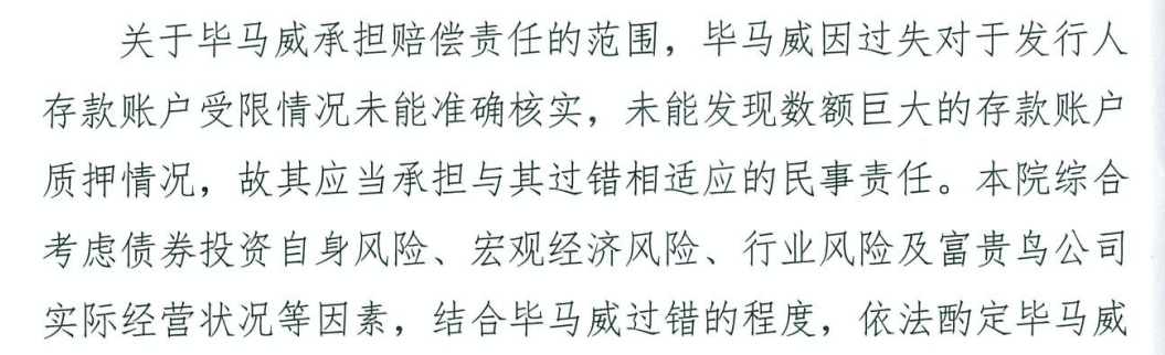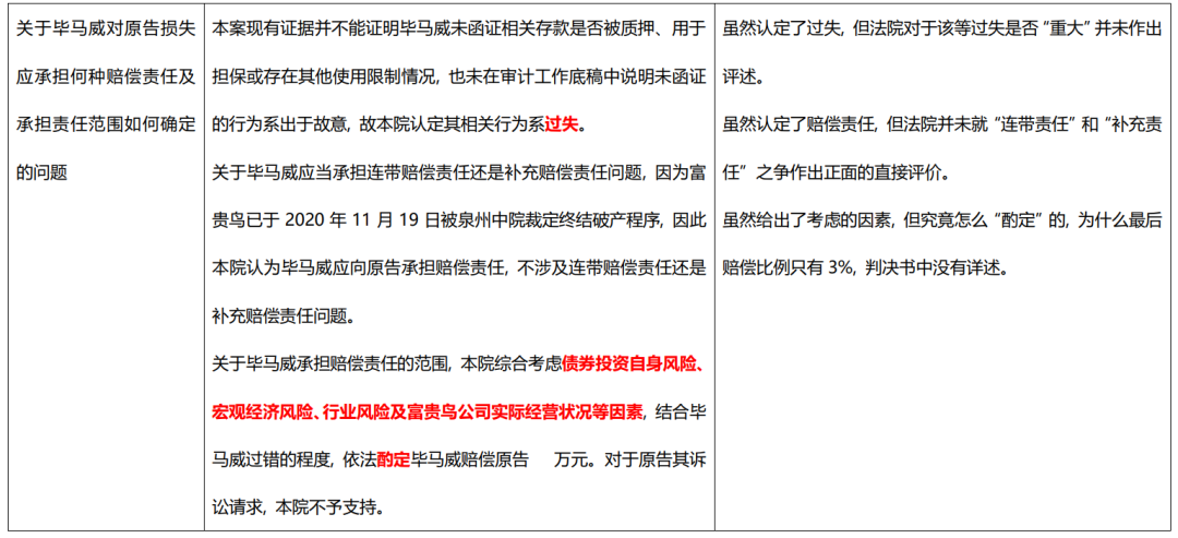 正如上文所述,在上述五個爭議焦點中,畢馬威的觀點幾乎都遭到了二中院的否定,但最終畢馬威所需承擔的賠償比例卻是極小的,而賠償比例的論述在法院的判決書中卻只有寥寥數行: