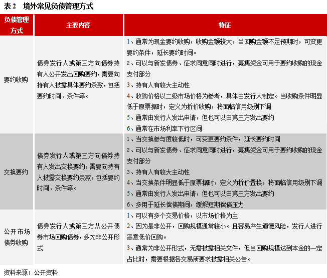 從目前看,國內正在探索要約收購,已發布了相關指引,但公開市場債券收購尚未有明確的政策,相比要約收購,其非公開性使得發行人容易產生道德風險,出現惡意低價收購的情況。相對來說,要約收購主要用于調整負債結構,而公開市場收購用于穩定價格異動。但不論哪種方式,當二級公開市場價格大幅打折時,除市場情緒波動外,往往透露出發行人償債能力的弱化,此時,發行人若進行打折要約回購,將壓實其流動性危機的傳言,帶來負面沖擊,尤其境內投資者的接受度低。如果發行人是為穩定債券價格異動,通過二級市場回購或是不錯的選擇,但如果是為了進行惡意打折兌付而在二級公開市場默默回購,則不利于建立健康的投資環境。我們需要認識到,對于困境企業,打折兌付或許是投資者短期止損的一種方式,接受打折兌付或是留債進入后期的債務重組,區別在于后期債務重組依然面臨很大的不確定性。當發行人沒有公開的化債方式時,隱蔽或拖延的方式可能帶來更大的風險。