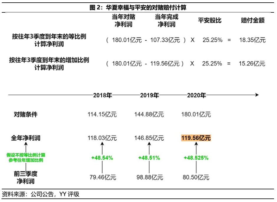 根據(jù)不同的測(cè)算方式,賠付金額約在15-20億元(據(jù)說(shuō)這個(gè)小目標(biāo)王文學(xué)也不打算給出來(lái)了,這也是矛盾導(dǎo)火索顯性化的原因)。根據(jù)平安兩次入股所設(shè)的對(duì)賭條件,賠付金額=(凈利潤(rùn)目標(biāo)-實(shí)際凈利潤(rùn))*平安股比,其中可根據(jù)圖2分別依據(jù)2020年前三季度凈利潤(rùn)“等比例”或“依照往年比例”測(cè)算全年凈利潤(rùn)規(guī)模,從而得出賠付金額可能在15億元至20億元之間。
