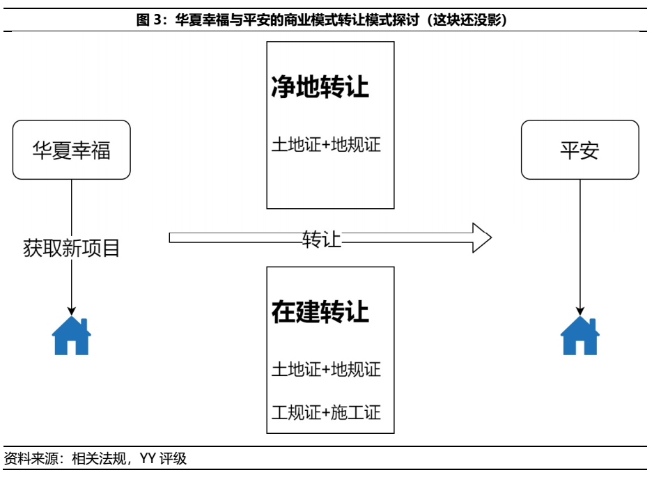 因此,就目前華夏幸福與平安的商業(yè)模式獲取模式,仍是以華夏幸福前期出資拿地并完成報(bào)批報(bào)建后選擇在凈地和在建時(shí)進(jìn)行轉(zhuǎn)讓。