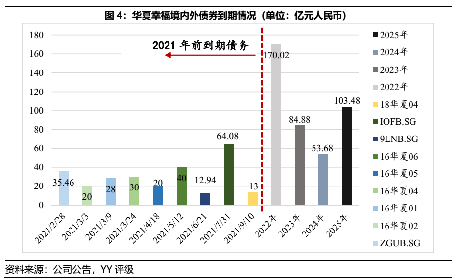 2021年迎來(lái)華夏幸福境內(nèi)外債券到期高峰,年度到期債券約在263.50億元左右,償還壓力大。此外,若存量債務(wù)行權(quán)采回購(gòu)統(tǒng)計(jì),則16華夏債、19華夏01、18華夏02和18華夏03的行權(quán)日均于2020年上半年,2021年的兌付規(guī)模則在313.75億元左右。