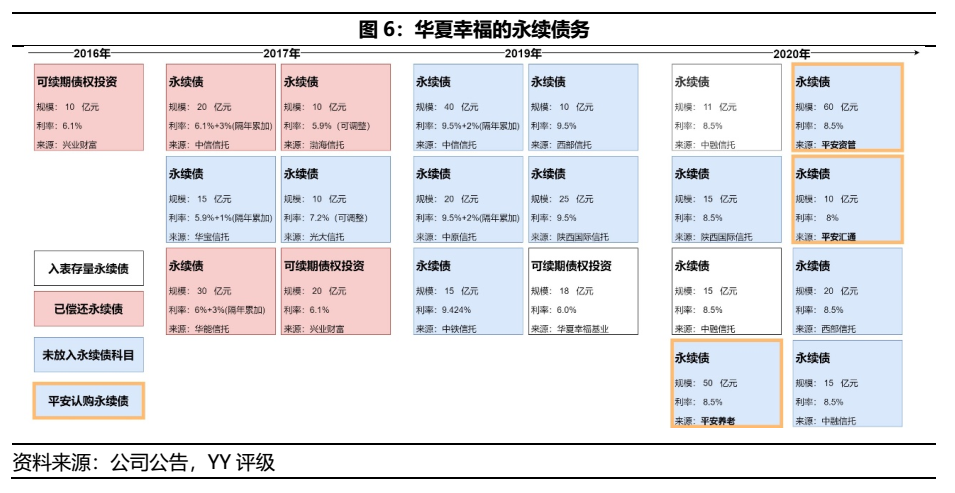 華夏幸福近年的永續(xù)債務(wù)(多為信托計(jì)劃認(rèn)購(gòu))規(guī)模較大,16年至今(含已償還)共發(fā)行439億元,在上市主體披露規(guī)模為67億元(2020年9月末),其中多只債券(下圖藍(lán)色)或因?yàn)閭鶆?wù)用途為華夏幸福子公司(九通基業(yè)、南京鼎通),而放于少數(shù)股東權(quán)益部份,需關(guān)注隱形的債務(wù)成本。其中,平安系公司共提供3只永續(xù)債,規(guī)模共計(jì)120億元。