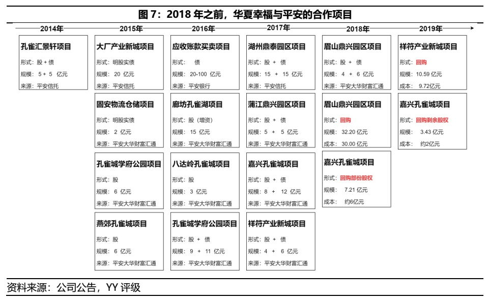 在平安戰(zhàn)略入股進(jìn)場(chǎng)前,自14年開(kāi)始便與華夏幸福深度合作,呈現(xiàn)一方加杠桿、一方賺項(xiàng)目資源的互惠模式。雖然這類(lèi)合作項(xiàng)目公告多宣稱(chēng)為“股性投資”,但就其短時(shí)間即退出和相關(guān)的回購(gòu)動(dòng)作,或存在明股實(shí)債的性質(zhì)。根據(jù)圖7,由于應(yīng)收賬款買(mǎi)賣(mài)項(xiàng)目合作情況未詳細(xì)披露,總合作規(guī)模約在182到262億元之間,相關(guān)合作項(xiàng)目均已退出。
