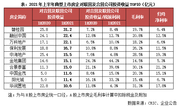 2021年上半年80家典型上市房企中,近半數(shù)房企合營聯(lián)營收入占稅前利潤的比重較上年同期呈現(xiàn)不同程度的上升,行業(yè)合作加深。而從對聯(lián)營及合營投資收益的絕對規(guī)模來看,上半年典型上市房企中25家房企實(shí)現(xiàn)同比增長,其中13家房企增幅超過100%,包括首創(chuàng)置業(yè)、越秀地產(chǎn)、招商蛇口等。龍頭房企的規(guī)模優(yōu)勢顯著,碧桂園以31.2億元的合聯(lián)營收益位列榜首,較上年同期增長20.9%,融創(chuàng)、萬科、保利等房企也依舊位居前列。