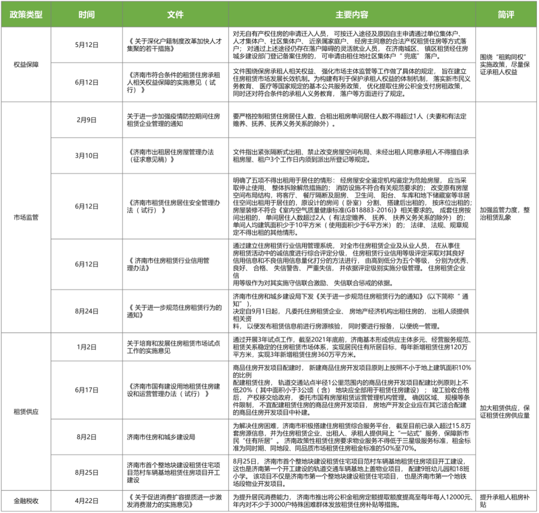 上海、廣州、重慶、杭州、西安、成都、合肥、海口等城市政策主要集中在強化市場風險監管方面。濟南在租賃供給、監管和權益保障等多方面均有相關政策的推出,力度較大;具體在租售同權、增加房源供應、搭建監管平臺、對企業和租客實施補貼方面全方位推進。