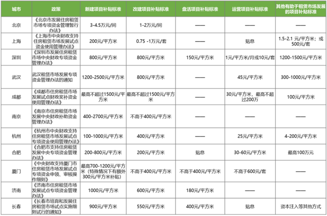 對于補貼主體也存在一定差異,但多數以國企、央企為主。從各城市已公開的支持項目清單來看,深圳第一批補貼的企業為深圳招商公寓;南京的幾批補貼基本都發放給本地企業和國企,例如南京安科置業有限公司和南京國立資產管理有限公司;武漢主要將補貼發放給具有國企及規模型房企,例如中海、城開、融創等。