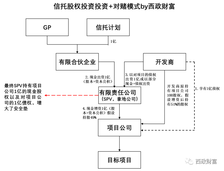 1. 信托計劃投資有限合伙LP份額(即1億)對有限責任公司SPV進行增資,部分進入實收資本,大部分進入資本公積。開發商則以對項目公司的債權(或債權+部分現金)對SPV進行出資。