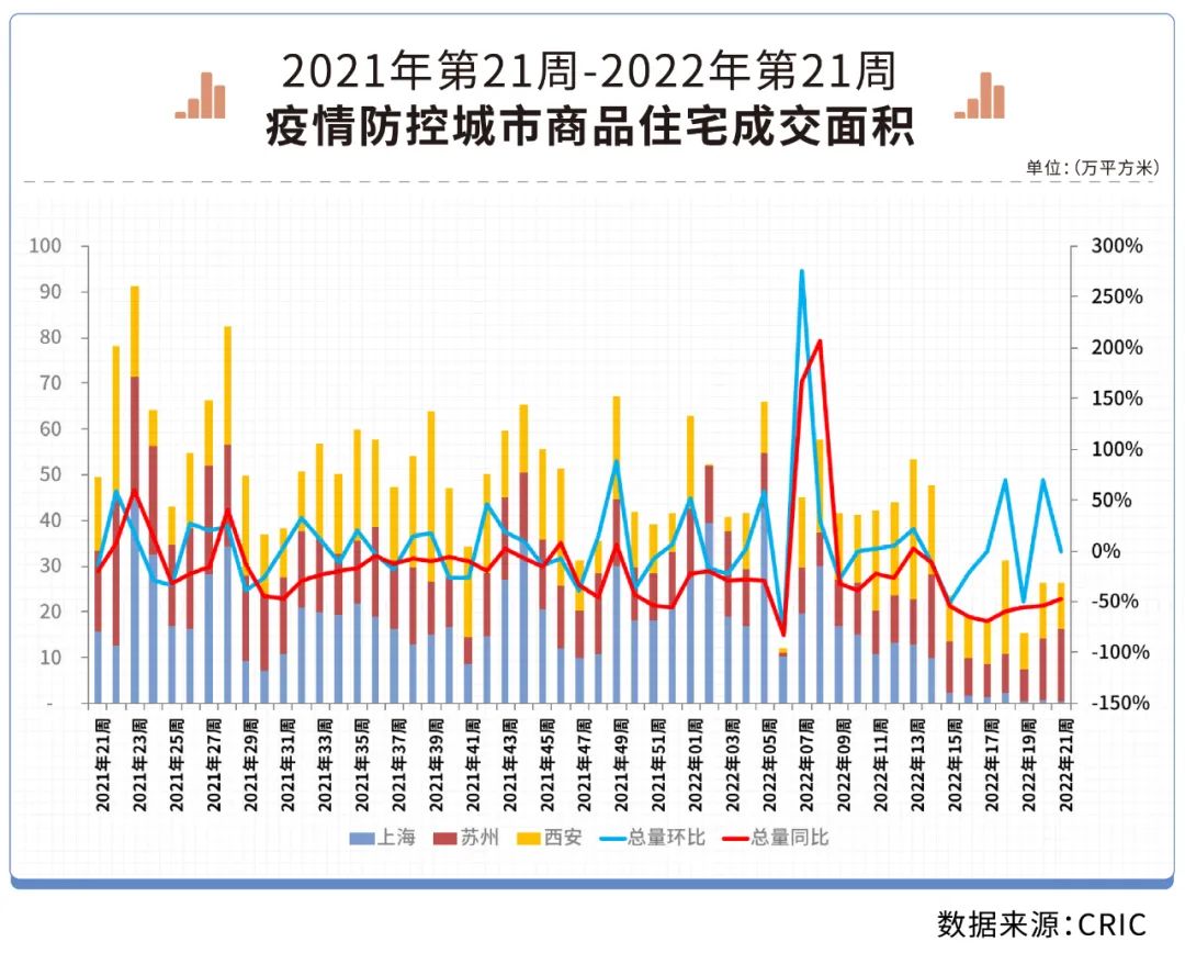 從21周(5.16-5.22)成交數據來看,3個尚在靜態管控中的城市,新房成交面積共計26萬平方米,環比基本持平,同比仍下降47%。其中,上海房地產市場繼續停擺,成交近乎歸零。