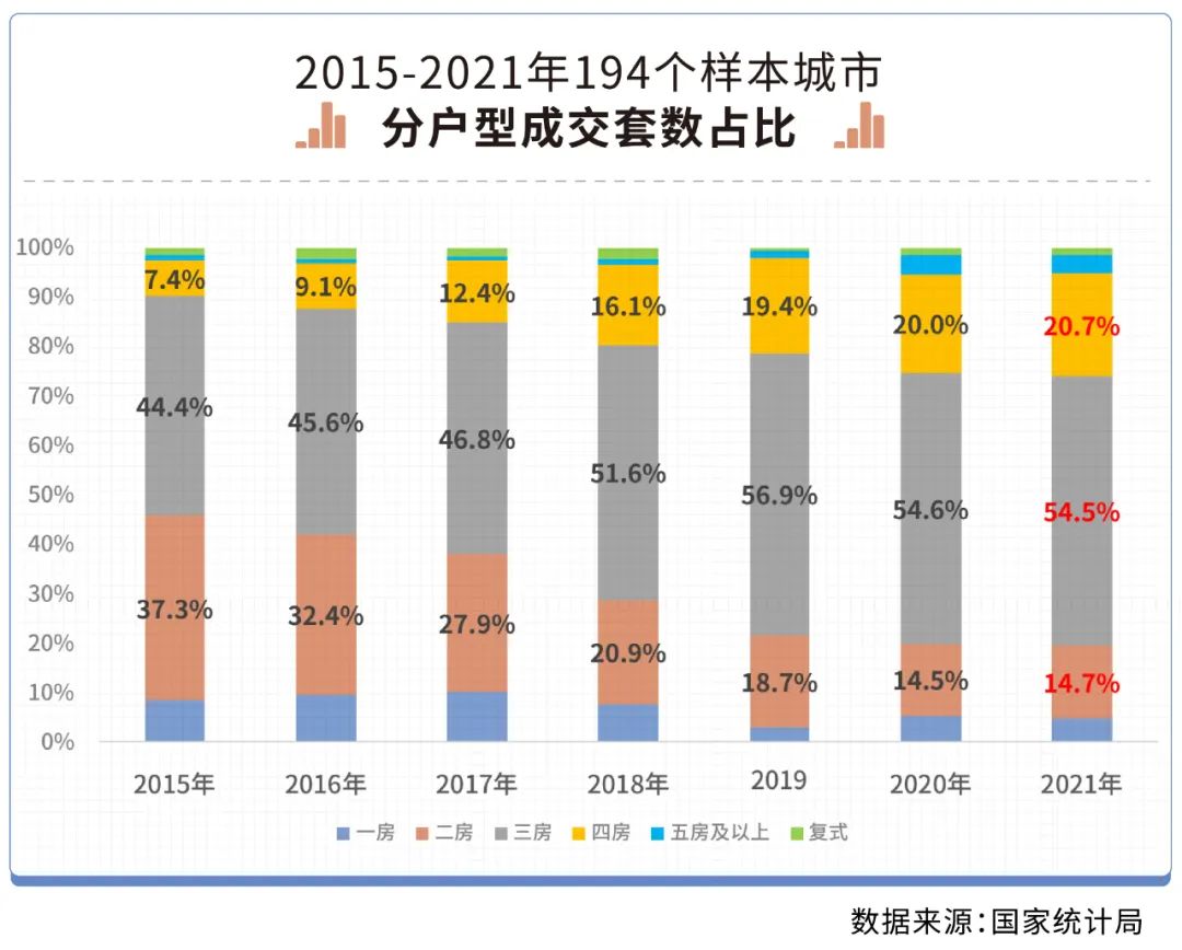 受限貸政策影響,大量改善性需求被壓制。2021年,改善性需求相對堅挺,據CRIC重點監測的 194個樣本城市成交結構數據顯示,三房成交套數占比高達54.5%,四房成交占比穩步提升至20.7%。但受限貸政策影響,不少城市二套房首付比例都在50%以上,部分城市更是達到70%乃至80%。