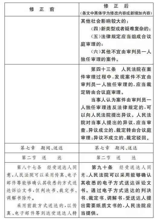 三、《草案》第九十條將電子送達(dá)途徑由“傳真、電子郵件等”改為“電子方式”,同時(shí)將現(xiàn)行的“但判決書、裁定書、調(diào)解書除外”改為“通過(guò)電子方式送達(dá)的判決書、裁定書、調(diào)解書,受送達(dá)人提出需要紙質(zhì)文書的,人民法院應(yīng)當(dāng)提供”。