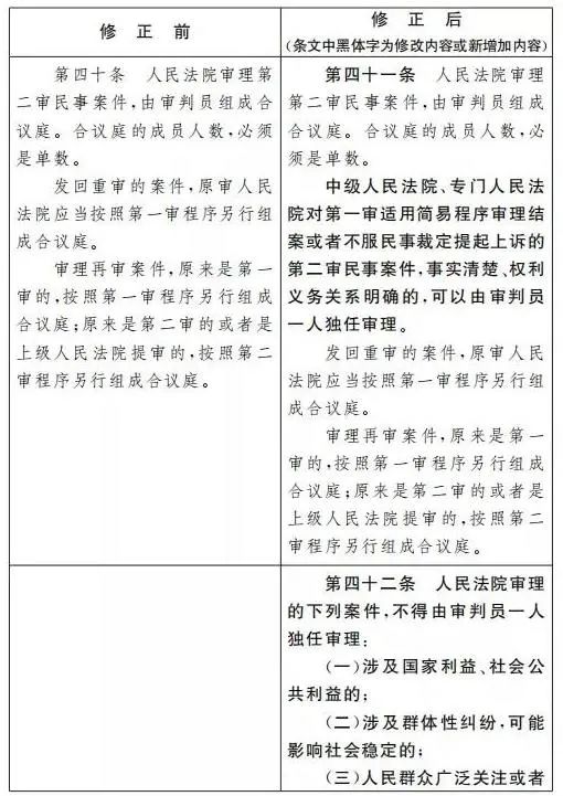 七、另外新增了獨(dú)任審判員制度可適用一審普通程序和二審程序的規(guī)定,同時(shí)將獨(dú)任審判員的適用條件以消極條件的方式列出。