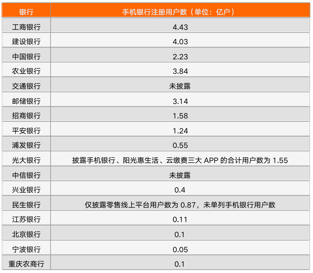 2、4家銀行存在數據未披露或未單獨披露手機銀行數據,包括交通銀行、光大銀行、中信銀行以及民生銀行。