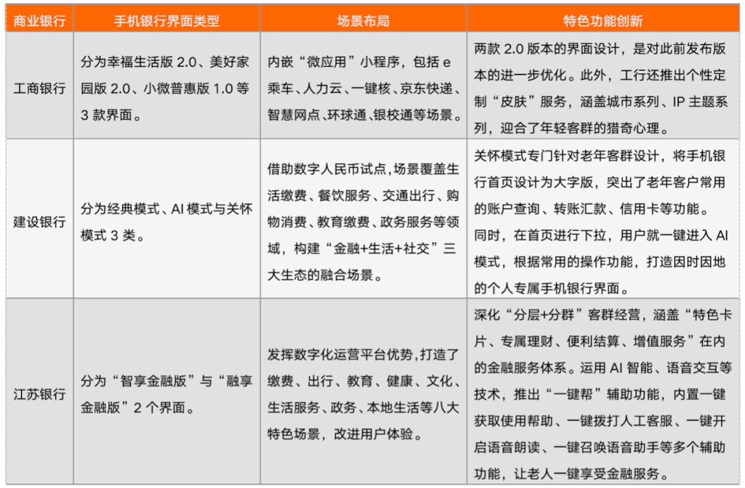 表 2:3家典型手機銀行的多版本界面與場景功能創新