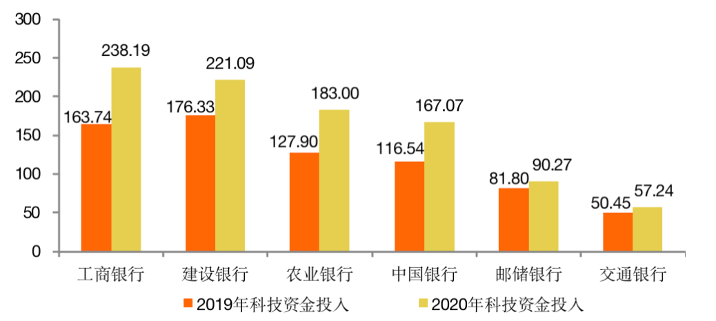 圖 3:2019-2020年6家國有大行科技資金投入規模(單位:億元)