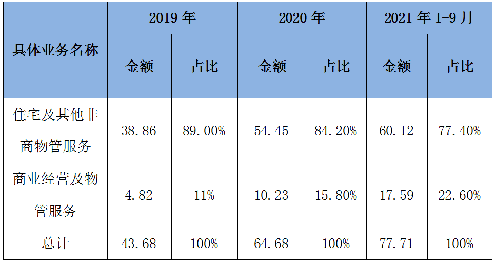 根據龍湖智創生活招股說明書顯示,從2019年到2021年9月,公司住宅及其他非商業物管服務對收入的貢獻率從89%下降到了77.4%,商業運營及物管服務對收入的貢獻率則從11%提升至22.6%。