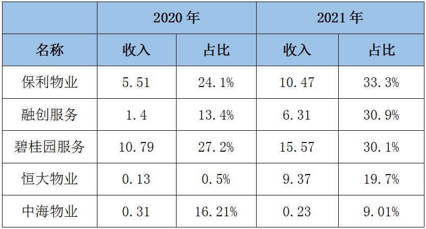 表2:2020-2021年部分頭部上市物企中第三方物管服務收入情況及占比(單位:億元)