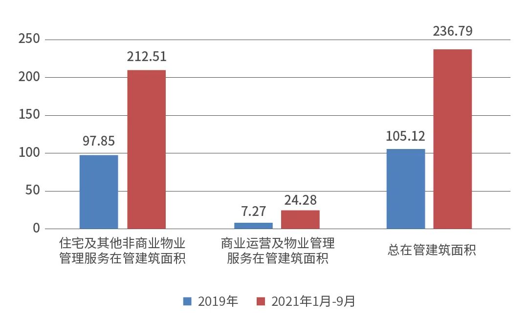龍湖智創生活的營業收入增長得益于其公司在管建筑面積的不斷增大。根據招股說明書顯示,自2019年到2021年9月,龍湖智創生活的住宅在管建筑面積為0.98億平方米、1.53億平方米及2.13億平方米,商業在管建筑面積從0.07億平方米上升到了0.24億平方米,總住宅面積為2.37億平方米,同比2019年上升125.71%。明顯可以看出,不論是住宅還是商業,在管建筑面積都迅速擴大,規模的擴大帶來了總收入上升。