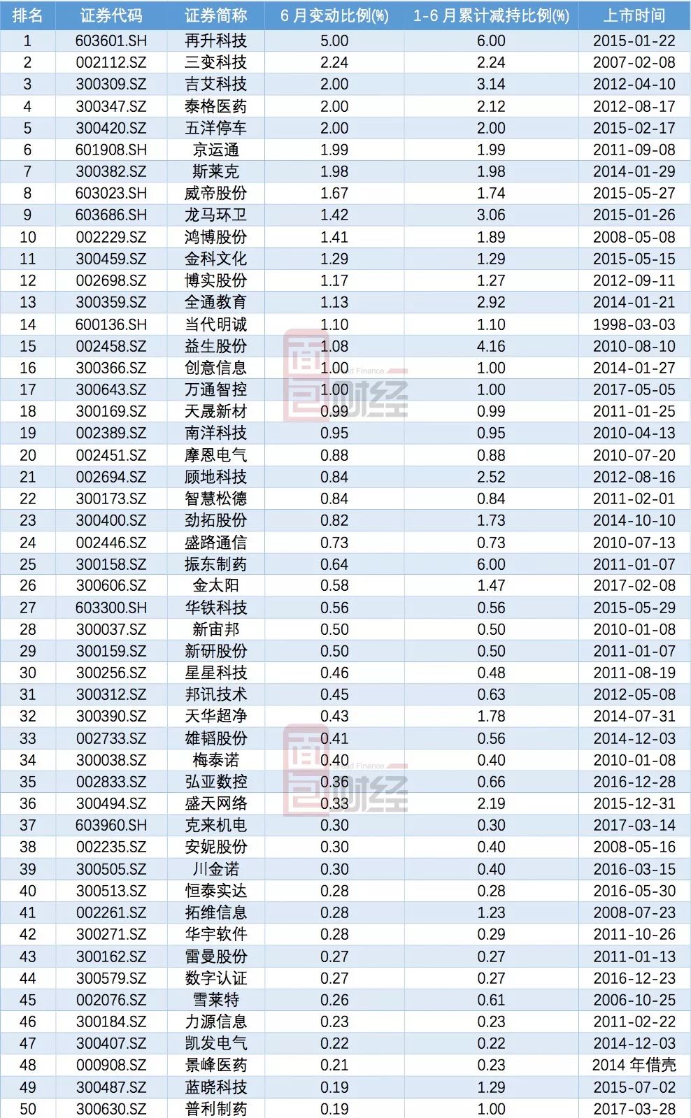 按照2018年6月減持比例排行,排名前十的是再升科技、三變科技、吉艾科技、泰格醫藥、五洋停車、京運通、斯萊克、威帝股份、龍馬環衛及鴻博股份。
