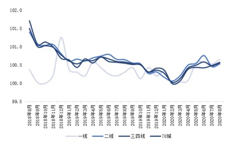 圖:2018年8月以來70城及各能級(jí)城市新建商品住宅價(jià)格指數(shù)環(huán)比走勢(shì)