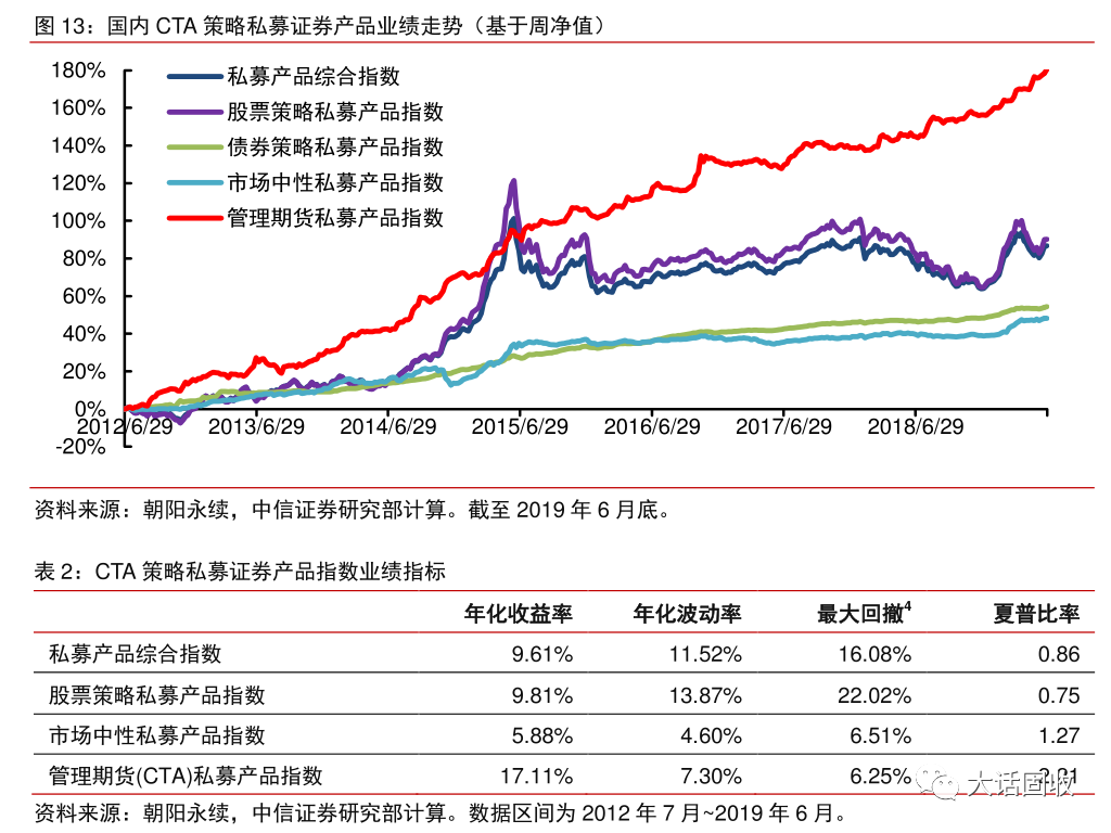 下面是到2019年年中,國(guó)內(nèi)各種策略的私募產(chǎn)品業(yè)績(jī)走勢(shì)。排名第一的CTA管理期貨(紅線)策略一騎絕塵,幾乎不受股票市場(chǎng)影響。