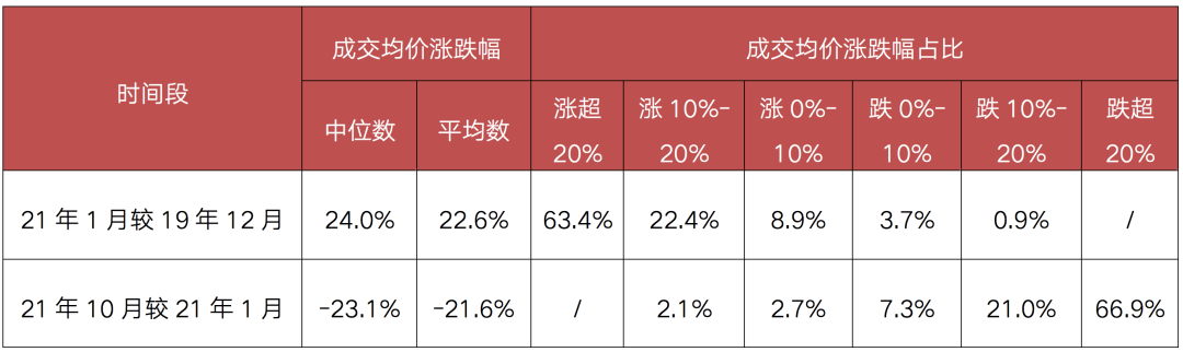 而在指導價出臺后,深圳二手房價格急速下跌。剔除零星成交的二手住宅小區,深圳2021年10月二手住宅小區售價較2021年1月趨勢性下滑,可比價格跌幅中位數、平均數分別為-23.1%和-21.6%,二手房價格現已基本回歸到2019年底。其中,多達66.9%的二手房小區可比價格跌幅超20%,另有21%的二手房小區可比價格跌幅在10%-20%。