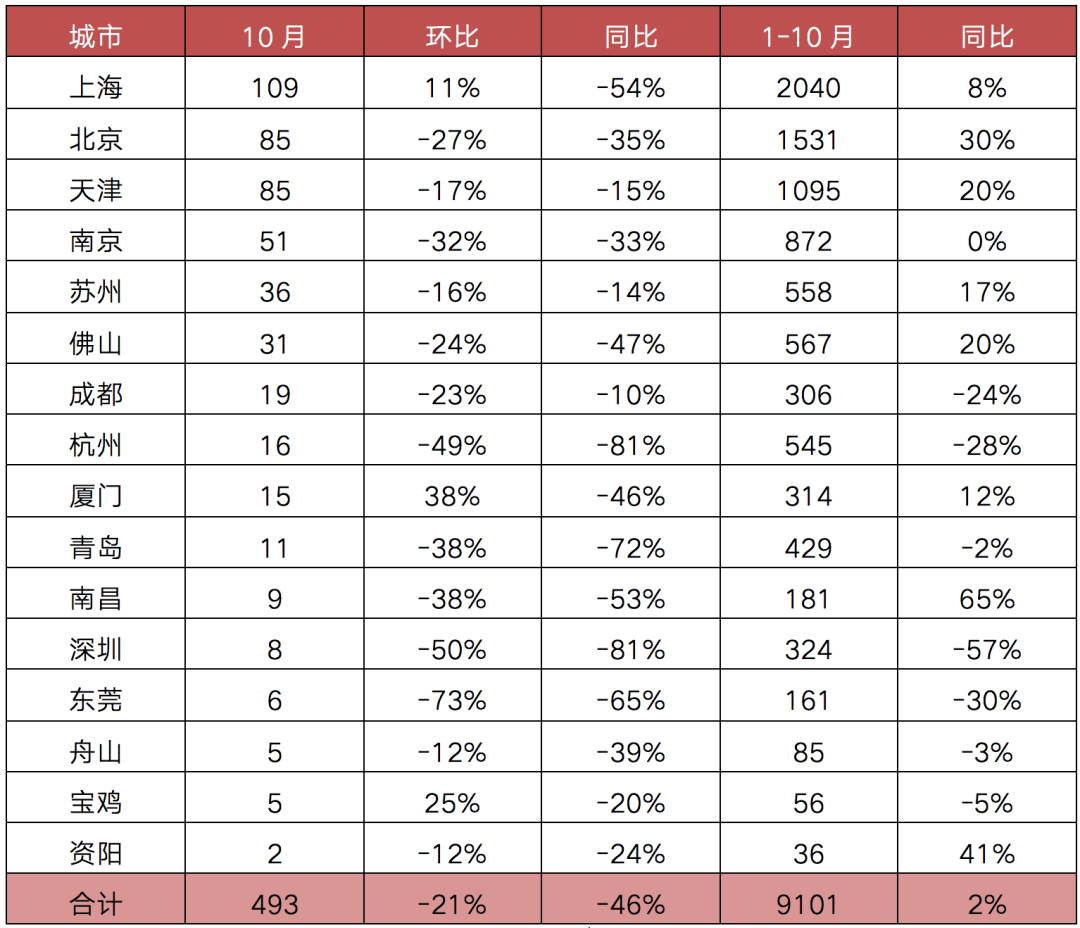 受此影響,上海二手房市場持續轉冷,10月成交面積109萬平方米,環比增長11%,同比仍下降54%。成交均價38811元/平方米,環比結構性微漲1%,同比仍下跌7%。1-10月,上海二手房累計成交2040萬平方米,同比增長8%。